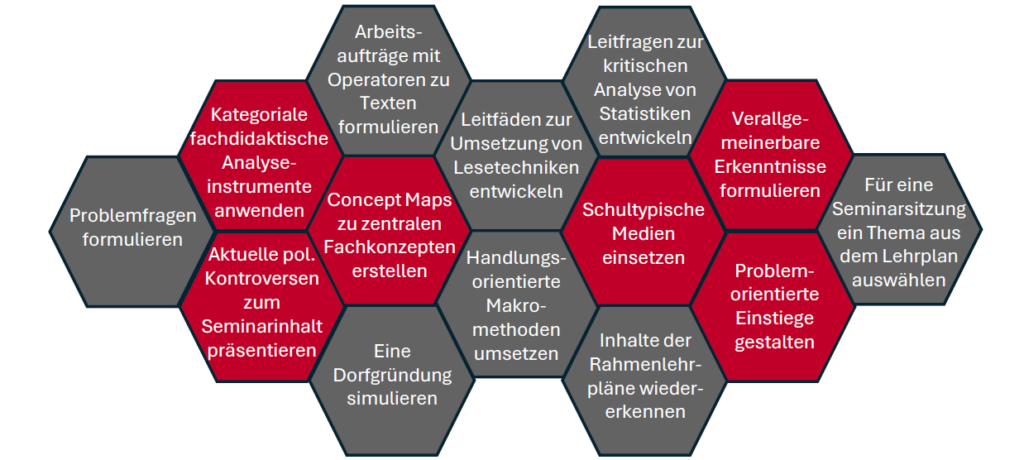 Im Arbeitsbereich „Didaktik der politischen Bildung“ entwickeln wir dafür praxisorientierte Bausteine, die in bestehende fachwissenschaftliche Lehrveranstaltungen integriert werden können. Die Bausteine werden dann gemeinsam mit den Dozentinnen und Dozenten der beteiligten Lehrveranstaltungen gezielt für die jeweilige Lehrveranstaltung angepasst.