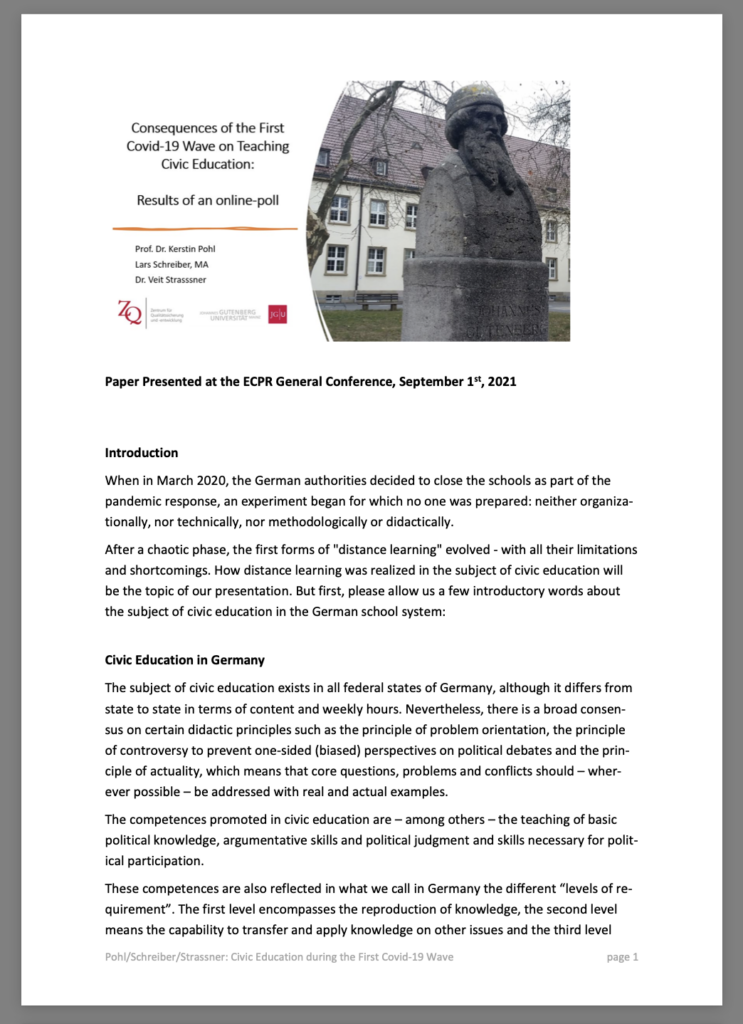 Kerstin Pohl, Lars Schreiber, Veit Straßner 2021: Civic Education during the First Covid-19 Wave. Results of an online-poll, Paper Presented at the ECPR General Conference, September 1st, 2021.