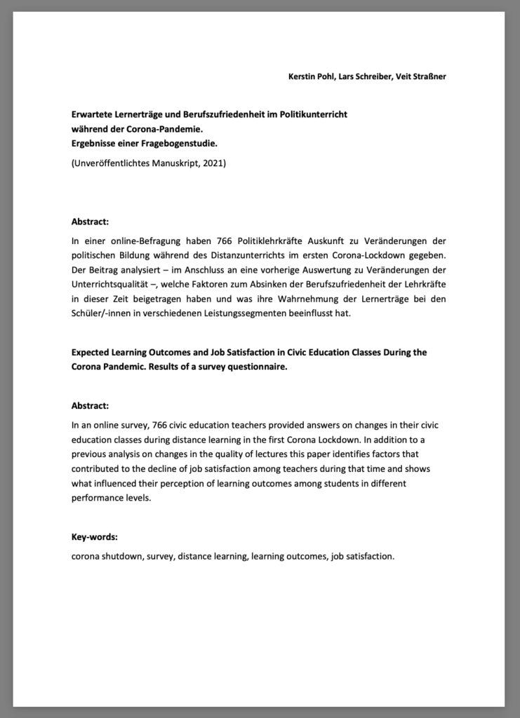 Kerstin Pohl, Lars Schreiber, Veit Straßner 2021: Erwartete Lernerträge und Berufszufriedenheit im Politikunterricht während der Corona-Pandemie. Ergebnisse einer Fragebogenstudie. Unveröffentlichtes Manuskript.